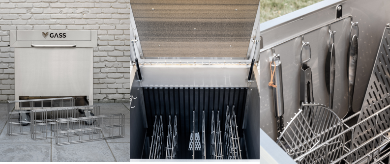 V-Grates and vertical channels make the VGASS wildly configurable. With nine different V-Grates, 20 channels, and the ability to accommodate accessories up to 24", you're certain to find the combination that's just right for your accessories. We even include an internal hook rack to store 5 of your favorite grilling and smoking tools. The best part? It's easy to change the layout to accommodate your needs today and in the future.