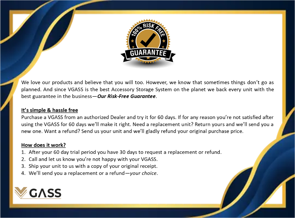 - Purchase a VGASS and try it for 60 days. If you're not satisfied we'll give you a replacement unit OR a full refund - your choice!